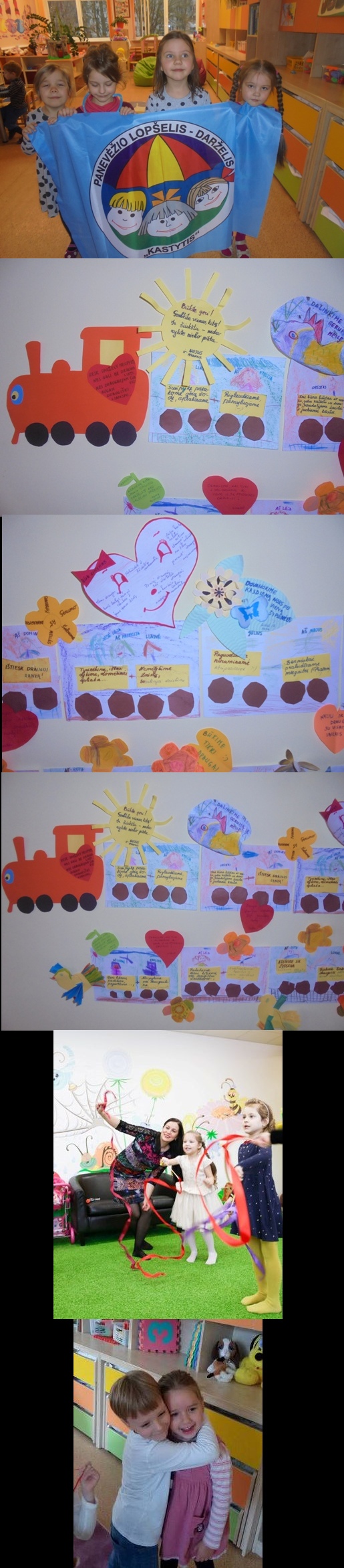 Panevėžio m. lopšelyje-darželyje „Kastytis“ visą 2016 m. vasario mėnesį ugdytiniai iš „Kačiukų“ ir „Nykštukų“ grupės kartu su auklėtojomis Regina Katiniene, Lina Jarackiene, Gražina Šimoniene kalbėjo apie draugystę, tolerantiškumą, meilę draugui ir šeimai, tarpusavio gražų bendravimą. Su šių grupių ugdytinių tėveliais rinkome gražius žodelius apie draugystę, gerumą ir meilę, o su vaikais išaplikavome traukinuką… Ne bet kokį, o vagonėliuose „vežantį“ gerumo, meilės, draugiškumo žodelius. Kiekvienas vaikas lipdė, piešė, puošė savo vagonėlius sugalvotais gražiais žodeliais, o auklėtojos juos užrašė ir sudėjo į vaikų išaplikuotus vagonėlius. Gražių žodelių pripildėme ne tik pilnus traukinuko vagonėlius, bet ir savo mažas širdeles. Gerumu ir draugiškumu dalinomės su draugais, auklėtojomis ir tėveliais. Kad mūsų traukinukui būtų linksmiau vežti gerumo žodelius užrašėme vaikučių mintis apie meilę. Labai išradingos šių 4 – 5 metų vaikų mintys. Vaikai sakė, o auklėtojos Regina, Gražina ir Lina vos spėjo užrašyti.