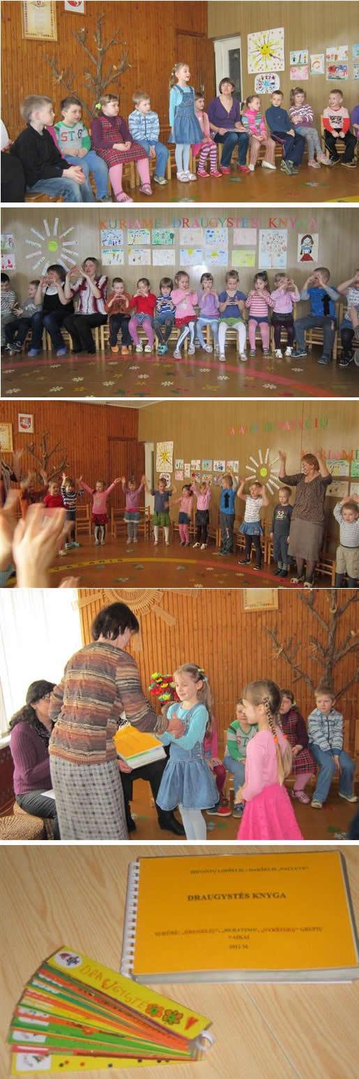 VšĮ „Vaiko labui“ įgyvendinamoje programoje „Zipio draugai“ dalyvaujantys Širvintų lopšelio-darželio „Saulutė“ priešmokyklinės „Drugelių“ grupės vaikai ir mes, pedagogai, pakvietėme 4 -7 m. vaikus, jų tėvelius, savo kolegas prisidėti prie akcijos „Savaitė be patyčių“. Akcijos laikas – 2012 m. kovo 19 -23 d. Akcijos metu „Drugelių“, „Buratino“, „Nykštukų“ grupių vaikai kartu su tėveliais, pedagogais kūrė ir gamino „Draugystės knygą“. Į šią knygą vaikai sudėjo savo kūrybą – eilėraščius, pasakas, kitus trumpus kūrinėlius, kuriuos iliustravo piešiniais. Vaikų kūryboje atsispindi draugystės ir bendravimo temos: kas padeda išlaikyti draugystę ir draugus, o kas griauna; kas vaikus džiugina, o kas skaudina; kaip padėti pasijusti geriau draugui ir sau sunkioje situacijoje; emocijos, siūlomos išeitys ir pan. Taip pat vaikai sukūrė po knygos skirtuką, kuriuose piešė piešinėlius, užrašė mintis apie draugystę. Nutarėme šią knygą kartu su skirtukais padovanoti savo miesto bibliotekai.