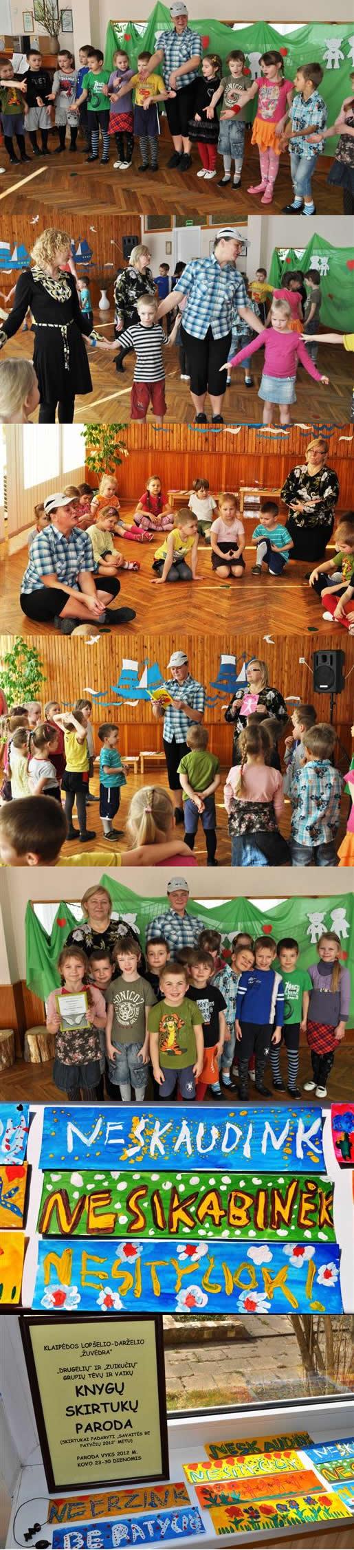 Klaipėdos lopšelio-darželio „Žuvėdra“ „Drugelių“ ir „Zuikučių“ grupių ugdytiniai, tėvai ir pedagogės 2012 m. kovo 19-23 dienomis dalyvavo respublikinėje akcijoje „Savaitė be patyčių“. Gražus skelbimas visą savaitę kvietė visus bendruomenės narius būti draugiškais, maloniais, laikytis gražaus bendravimo nuostatų. Visą savaitę ugdytiniai su pedagogėmis kalbėjo apie draugystę, įvairias bendravimo problemas, aiškinosi, kas yra patyčios, kaip jų išvengti. Taip pat kartu kūrė „Draugystės knygas“, kurias nusprendė dovanoti savo bendraamžiams, „Spalviukų“ ir „Pelėdžiukų“ grupių ugdytiniams. Su tėveliais ir kitais savo artimaisiais vaikai darė knygų skirtukus, kuriais visi galėjo pasidžiaugti parodoje, vykusioje 2012 m. kovo 23-30 dienomis. Vaiko gerovės komisijos iniciatyva buvo suorganizuotas vyresnėse ir priešmokyklinėse grupėse „Draugiškiausio grupės vaiko“ konkursas. Visą savaitę patys vaikai įvairias būdais rinko pagal konkurso nuostatus patį draugiškiausią savo grupės vaiką. Kiek buvo daug diskusijų, kiek nuomonių, kol nusprendė, kuris pats pats draugiškiausias.