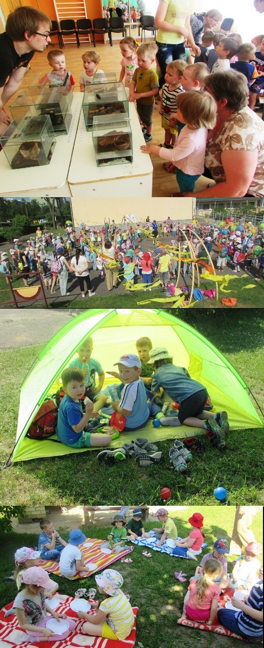 Saulei ritinėjantis danguje, o jos spindulėliams švelniai glostant vaikų skruostukus, pradėjome Vaikų dieną. Drauge iškėlėme šventės vėliavą. Vaikai, nuo pačių mažiausių iki didžiausių, skanduodami bei eiliuodami pristatė savo grupes. Džiaugsmingai plojome, džiaugėmės vienas kito buvimu, o apglėbę vienas kitą per pečius, garsiai visam pasauliui sušukome paprastą, tačiau galingą žodį „Taika“, taip išreikšdami savo norą gyventi pasaulyje be karų, neapykantos, keršto, pykčio ir barnių. Juk saugi aplinka padeda vaikams augti laimingiems, skleistis jų kūrybiškumui, ypatingiems gebėjimams, nepaprastiems talentams. Mergytės ir berniukai auga svajodami, o iš mažų vaikiškų svajonių kyla didelės ir reikšmingos svajos, darančios pasaulį geresnį ir gražesnį. Balionėliai su vaikų užrašytomis svajonėmis nuskrido aukštai, aukštai, sustiprindami visų mūsų viltis, kad viskas bus gerai. Vėliau, atlikę nuotaikingą rytinę mankštą bei pamojavę savo draugams, darželinukai išsiruošė iškylauti. Puikiai įrengtose stovyklavietėse netrūko įdomios ir turiningos veiklos: muilo burbulų pūtimas, piešimas spalvotomis kreidelėmis, judrūs žaidimai, žaidimai su smėliu ir vandeniu ir kt. Darželio virėjos vaikams atgabeno didžiulį puodą gardžios košės. Visi valgė apsilaižydami, šauniąsias virėjas girdami. Užkirtę košės,iškylautojai ėmėsi tuštinti kuprines, patys ragavo ir kitus noriai vaišino. O po saldaus pietų miegelio mažieji tipeno į salę, kur jų laukė nuostabūs gyvūnėliai – nariuotakojai: paukštėdai, tarakonai, gyvalazdės, šimtakojai ir daugelis kitų. Viską apžiūrėję, išklausinėję ir išsiaiškinę, kupini gerų emocijų ir neišdildomų įspūdžių, ikimokyklinukai iškeliavo į namučius. Tikrai bus, ką papasakoti! Štai tokia buvo mūsų darželinukų Vaikų gynimo diena, nuotaikinga, linksma, smagi ir skani!