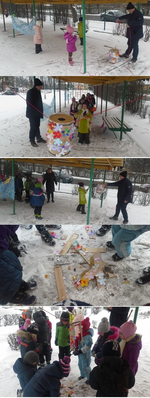 Taigi, tėvelis – danas atnešė į grupę medinę statinaitę – Danijos Užgavėnių simbolį. Visi kartu nuostabiai papuošė ją savo rankomis pagamintomis gėlėmis (nes buvo danės mergaitės gimtadienis, nors puošybos elementus galima pasirinkti bet kokius), į vidų pridėjo daug saldainių ir  stipriai užsandarino.  Tam kad žiema greičiau išeitų ir pagaliau ateitų šiltas ir saulėtas pavasaris, reikia šią Užgavėnių statinę smarkiai mušti su specialiu strypu (buvo panaudota beisbolo lazda), kad ji subyrėtų į šipulius. Vaikai su didele jėga ir užsispyrimu pakaitomis daužė pakabintą statinę, kol ji visiškai subyrėjo ir iš jos iškrito saldainiai. Tai kartu ir efektingas jėgos pratimas, kurį atlikti vaikai stipriai motyvuojami, nes siekia atsikratyti blogio ir pasiekti pergalę prieš statinę.