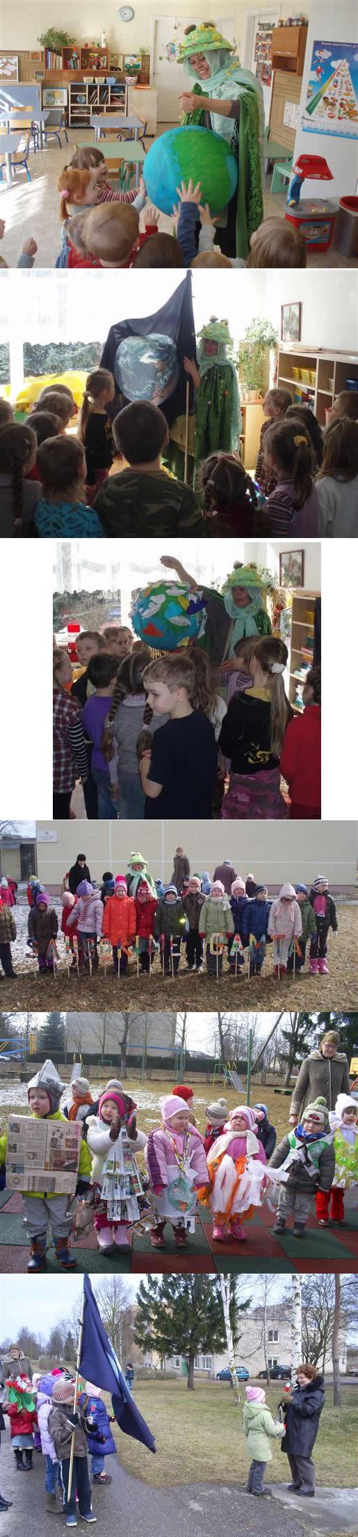 Žemės dienos rytą visus besirenkančius į lopšelį-darželį pasitiko paukščių balsų muzikinis įrašas. Vaikus aplankė žemės deivė Žemyna, nešina Žemės vėliava ir dideliu gaubliu. Žemyna vaikams papasakojo legendą apie žemės sukūrimą, apžiūrėjo ir aptarė Žemės vėliavą, kartu su vaikais diskutavo apie Žemę, gamtą, jos reiškinius, aplinkosaugos problemas. Simbolinį žemės gaublį vaikai papuošė ant saulučių, paukštelių, gėlyčių trafaretų užrašytais linkėjimais Žemei. Žemyna vaikams išdalino gėlių sėklytes ir pakvietė dalyvauti akcijoje „Žalia stotelė“, kurios metu vaikai sės, daugins vasarines ir rudenines gėles, kad vėliau gėlytės puoštų lopšelio-darželio teritoriją.