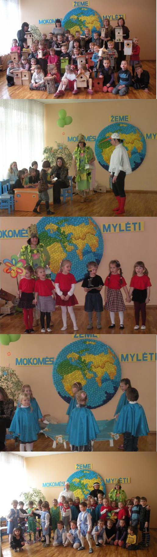 Na o auklėtojos  Laimutė Andriukevičienė, Renata Bačiulienė organizavo viktoriną „ Mokausi mylėti, Tave Žeme“ , kurioje dalyvavo Palangos lopšelių-darželių „Ąžuoliukas“ „Boružėlių“, “Gintarėlis” „Kiškučių“, “Žilvinas” “Gintarėlių“ ir Kretingos lopšelio – darželio „Voveraitė“ “Švelnukų“ vyresniųjų grupių vaikai ir pedagogai. Šventės dalyvius  nuotaikingai pasitiko tik ką iš tolimos kelionės grįžęs „Gandras“   ir kartu su vaikais dainele pasveikino saulę, debesėlį ir iš po žiemos speigų atgijusią Žemę. Viktorinoje vaikams buvo  pateikiami klausimai apie gamtos reiškinius, gerus ir blogus poelgius gamtoje, jos taršą, mįslės apie gyvūnus. Nedidelį egzaminą vaikams surengė ir gudrioji Šarka ( meninio ugdymo mokytoja Nijolė Petrauskienė), kuri pasidomėjo kaip gerai vaikai skiria ir atpažįsta paukščių balsus. Vaikams teko susitikti ir vilką (auklėtoja Jūratė Stončienė), netikėtai užklydusį į viktoriną su pilnu šiukšlių maišu, kurį vaikai turėjo išmokyti kaip rūšiuoti antrines žaliavas.