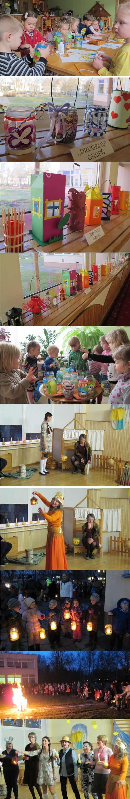 Prieš savaitę grupėse atsidarė žibintų dirbtuvėlės. Ten kiekvienas vaikas kūrė, gamino šventei žibintą. Priemones naudojo pačias įvairiausias: plastiką, stiklą, popierių, kartoną, medį ir t.t. Kiek išmonės, fantazijos parodė vaikai, tėveliai ir kiti šeimos nariai! Šiais žibintais visi galėjo grožėtis surengtoje Žibintų parodoje.