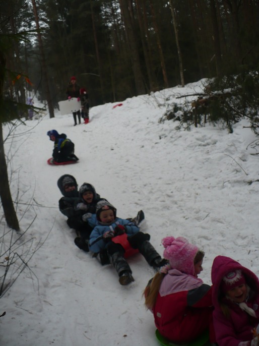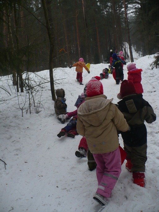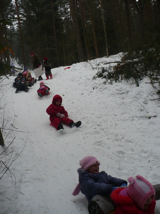 Gniaužiantis kvapą greitis, sniego pliūpsniai į veidus, kelios sekundės rimties ir vėl bėgte į kalną – taip paskutinę žiemos dieną palydėjo Anykščių vaikų lopšelio-darželio „Žiogelis“ ugdytiniai, jų tėveliai ir pedagogai. Autobusu nuvykę iki miško, toliau patraukė pėsčiomis vaizdingomis Liūdiškių piliakalnio apylinkėmis. Čia vienas kalnelis už kitą gražesnis, pusnis viena už kitą aukštesnė. Drąsesnieji ieškojo vis aukštesnių, daugiau adrenalino suteikiančių kalvų, kad galėtų nuo jų nučiuožti. Rengė toliausiai, greičiausiai nučiuožusio rungtis. Nuo kalno čiuožė ne tik vaikai, bet ir mamos. O, kaip smagu po daugel metų vėl pasijusti vaiku ! Tai nepakartojama.