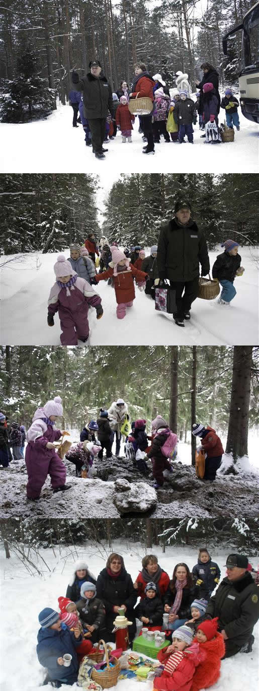 Sudėję į šėryklą visas atvežtas lauktuves: daržoves, duonos gabalėlius, grūdus, obuolius, kruopas, suradome puikią miško aikštelę, kurioje atsigėrėme karštos arbatos, pasivaišinome, pabėgiojome po mišką, pasigrožėjome sniegu pasipuošusiais medžiais.