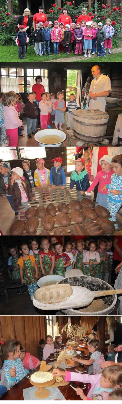Visus ,,pasitiko“ iškūrenta krosnis ir išrauginta duonos tešla duonkubilyje. Daug įdomaus papasakojo šeimininkas Nerijus ir apie krosnį, ir apie įrankius, ir apie duonos kepimą. Sužinojome, kad žmonės duoną kepdavo kartą per mėnesį. Šeimininkas su žarstekliu sužėrė žarijas ant prieždos (tai vieta prieš kepamosios krosnies angą), pušine šluota iššlavė krosnį. Pirmame kepale išspaudė kryžių – taip buvo laiminama duona ir vadinama šventa. Kiekvienam buvo suteikiama nepakartojama galimybė pačiam ant suformuoto duonos kepalėlio palikti savo pirštų anspaudą ar ženklą ir jį išsikepti ką tik iškūrentoje krosnyje. Sustoję prie karščiu alsuojančios krosnies, išgirdome ant sienos išraižytus ir auklėtojos perskaitytus Just. Marcinkevičiaus eilėraščio „Šventa duona“ žodžius: