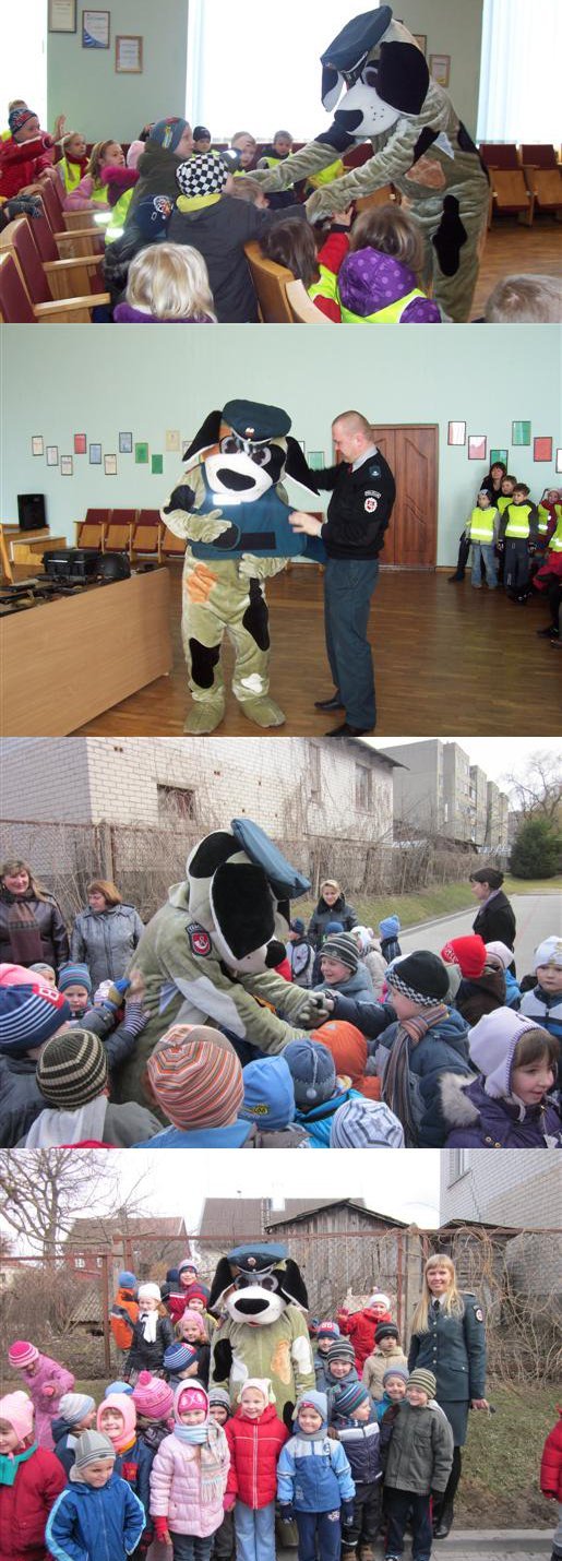 Policijoje mus pasitiko „policininkas“ šuniukas Amsius. Jis pakvietė mus visus į salę. Vaikai buvo supažindinti su policijos darbo kasdienybe. Taip pat vyko diskusija, kaip elgtis gatvėje, kur galima žaisti, kaip nepatekti į sukčių pinkles. Susipažino su naudojamomis policininko darbo priemonėmis,apranga. Jiems buvo parodyti tarnybiniai ginklai, antrankiai, guminės lazdos, neperšaunama liemenė, alkoholio matuoklis, skydas. Kiekvienas vaikas turėjo galimybę į rankas ginklą, užsivilkti liemenę, palaikyti guminę lazdą ir t.t.