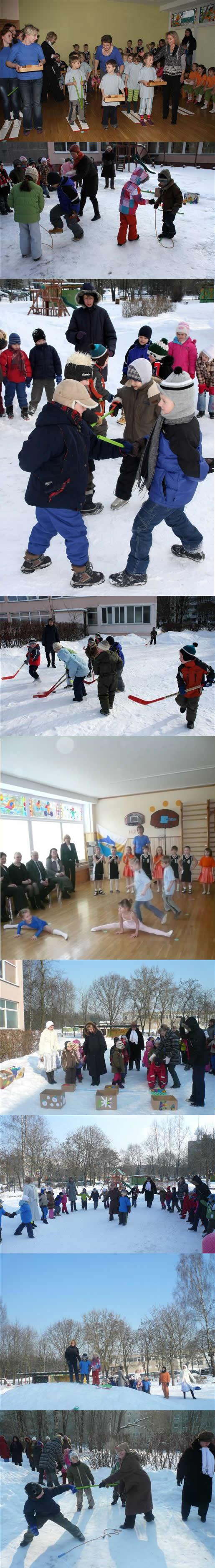 Tai sportinio parengtumo, sveikatos ir džiaugsmo šventė, renginys.Žaidimai kieme žiemą – puiki aktyvaus poilsio forma, leidžianti pajusti malonumą, džiaugsmą bei gamtos grožį. Šaltas oras grūdina organizmą, teigiamai veikia nervų sistemą, o judrūs žaidimai – tai tikras vaikų džiaugsmo šaltinis. Žaidynių, šventės vieta išradingai parengiama salėje ir lauke. Parengiami darbeliai, įvairūs žaisliukai kuriais apkabinėjami medžiai (tarsi liūdintys žiemą), lesyklėlės paukšteliams. Visi dalyviai prisistato, atkeliauja Sniego karalienė…žaidžiame estafetes : „Sniegkrepšys“, „Miesteliai su sniego gniūžtėmis“, „Sniege gyvatė“, „Grumtynės su lazda“, mokomės slidinėti „popierinėmis slidėmis“ sporto salėje, statome „Sveikuolių pilis“ tai lyg linksmas miestas, kurio viduryje supilta didelė „tvirtovė-rūmai“ (sniego kalnas kieme) nuo kurio vaikai čiuožia su rogutėmis, lipdo sniego senius, žaidžia ledo ritulį.