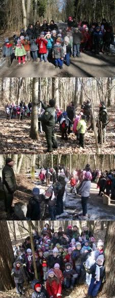 Įėję į mišką, vaikai ieškojo tinkamų medžių į kuriuos įkeltų namelius paukščiams, talkino miškininkams paduodami, palaikydami inkilus. Kiekvieną pritvirtintą inkilėlį palydėdavo garsių plojimų banga ir nuoširdūs linkėjimai sparnuočiams juose apsigyventi. Kai visi inkilai buvo pritvirtinti, vaikai besivaduojančiam iš sniego ir ledo gniaužtų miškui padovanojo dainą apie pavasarį žadinantį vyturėlį, pačios beieškantį strazdą ir raibąją gegutę.