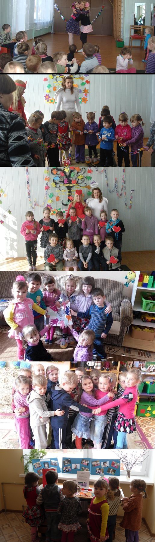 Vaikai savaitę pradėjo nuo pokalbio apie komplimentus ir prisiminė gražius mandagumo žodelius. Peržiūrėję animacinį filmuką „Katino Leopoldo nuotykius“ vaikai aptarė, kokie jiems pasirodė animacinio filmuko herojai, kaip jie elgėsi, kas nusikalto ir kas atsitiko. Antradienį į salę visus sukvietė „išdykę“ vaikai, kurie pasakojo, vaidino, kaip jie moka draugauti,- situacijų inscenizacija „Gyvenkime draugiškai“. Herojams ne visada pavykdavo sutarti, todėl lopšelio – darželio vaikučiai mokė kaip reikia elgtis, ką daryti, kai supyksti, kaip padėti nuliūdusiam draugui. Vaikai sužinojo kiek daug žmogus gali jausti ir kad nei vienas jausmas nėra blogas, svarbiausia tinkamai reaguoti. Trečiadienis – komandinių žaidimų diena „Esu ne vienas“. Vaikai žaidė komandinius žaidimus, o tuo pačiu mokino ir kitas grupes. Žaisti komandoje – tai žaisti bendraujant, derintis vienas prie kito, žaisti ne už save, o už komandą, mokytis „sveiko“ rungtyniavimo, laimėti ir pralaimėti. Apkabinimų diena – ketvirtadienis – vaikams labai patiko: vaikai sakė komplimentus vienas kitam, susitikę apsikabindavo, darė „Gražių palinkėjimų draugui girliandą“, lankėsi fotografijų parodoje „Ką pasako mūsų veidelis“, nuotraukose atsispindėjo vaikų įvairios emocijos ir jausmai.. Penktadienį ugdytinius pakvietėme į auklėtojų vaidinamą spektaklį „Baltojo angelėlio dovana žemės vaikams“, kurį vainikavo daina „Sparnai gerumo“.