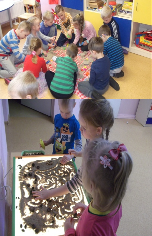 Tikriausiai kiekvienas atsimename savo vaikystėje žaidę su smėliu: merkėme į jį rankas, barstėme, statėme pilis, rausėme urvelius, puošėme gėlėmis, bandėme paragauti ar prisikrauti į kišenes, piešėme pirštu keverzones. Atsimename savo pačių vaikystę – namo kieme stovėjusi smėlio dėžė visada buvo kupina bendraminčių – mažųjų statybininkų, „architektų“ ar šiaip laisvos meniškos sielos draugų. Koks būdavo sujudimas, kai atveždavo naujo smėlio užpilti! Būriuodavomės šalia, ištikimai laukdavom ir puldavom užsiimti geresnę vietą prie smėlio kalnelio. Smėlyje kiekvienas gali nevaržomai sukurti kažką savo, daugybę kartų sugriauti ir vėl atstatyti, jį malonu liesti – galbūt todėl smėlis taip pritraukia. Vaikai kasdien išgyvena įvairiausių jausmų paletę – supyksta, liūdi, nerimauja. Įvardinti savo jausmus vaikams dar yra sunku, bet jie randa kitų būdų – kaip ,,išveikti” kylančius jausmus. Todėl psichologai, dirbdami su vaikais, pasitelkia vaikams priimtiniausius ir natūraliausius metodus. Viena iš tokių visame pasaulyje populiarėjančių galimybių atskleisti vidinį vaiko pasaulį – žaidimas su smėliu. Mes „Kiškiukų“ ir „Lašiukų“ grupių auklėtojos nusprendėme smėlio terapiją padaryti grupėje. Paruošėme keturis kampelius. Pirmame – „Mėnulio“ smėlis su įvairiomis formelėmis. Antrame- gaminome patys kinetinį smėlį. Trečiame kampelyje- šviesos stalas, smėlis ir gamtinė medžiaga. Ketvirtame- vaikai dažė smėlį įvairiomis spalvomis.