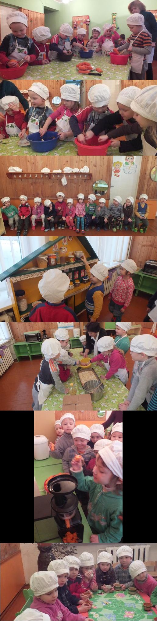 2015 m. vasario mėnesį „Nykštukų“ grupės vaikučiai gamino obuolių ir morkų pyragus, „Drugelių“ grupė kepė sausainiukus su obuolių įdaru, „Zuikučių“ grupė gaminosi morkų salotas, o „Boružėlių“ grupė spaudė obuolių ir morkų sultis. Vaikai grupėse kalbėjo apie sveiką maistą, kokia jo nauda, pasakojo, koks jų mėgstamiausias patiekalas ir kaip jį pasigaminti, diskutavo ir dalijosi savo žiniomis: kaip maisto produktai atsiranda ant mūsų stalo, kur jie auga, kuo jie skiriasi. Pačių keptais kepiniais ir padarytais skanėstais, vaikai dalijosi ir vaišino darželio darbuotojus ir tėvelius.
