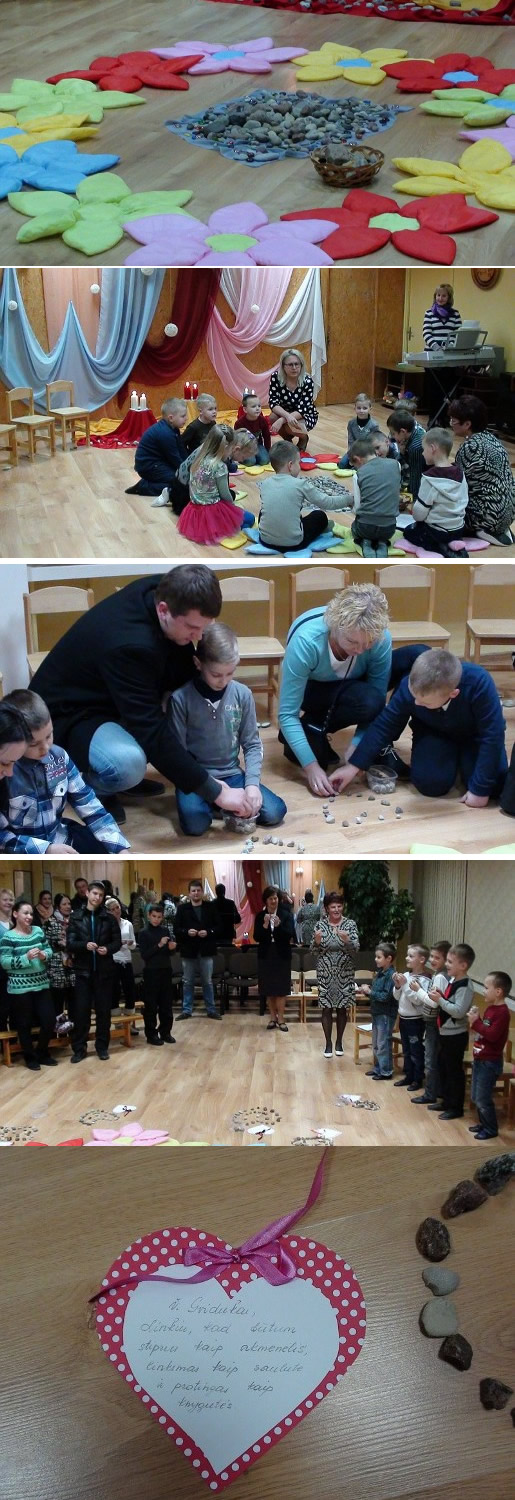 2014 m. Mažeikų lopšelio-darželio „Berželis“ priešmokyklinės grupės „Spindulėliai“ vaikai ir auklėtojos pakvietė tėvelius pakalbėti apie akmenėlį, jo jausmus. Diskutuodami apie žodžių, minčių, poelgių gerumą šį kartą atkreipėme dėmesį į paprastą akmenėlį. Juk taip retai susimąstome apie kasdien ant tako matomą akmenuką. Akcentavome vaikams, jog akmuo gali būti ginklu silpno, nelaimingo žmogaus rankose, taip pat ir žaislas besišypsančio vaiko delnuose. Kokiam tikslui mes paimsime akmenį į savo rankas – tuo jis ir taps. Tik geraširdiško žmogaus rankose jis atgyja, įgauna įvairias formas, spalvas. Tada akmenukas pradeda švytėti, kalbėti, puošti. Kartu su tėveliais vaikai džiaugėsi akmenukais, klausėsi jų, dainavo, grojo, žaidė su jais. Tėveliai ant „širdelių“ parašė palinkėjimus savo vaikams, o mūsų auklėtiniai tėveliams padovanojo po akmenėlį – širdutę ir savo minteles apie gerumą. Visada paklauskime akmens ar jis nori būti ginklu mūsų rankose? Jis turi širdį, vaikišką širdį, akmuo neturi akmeninės širdies… Vaikų lūpose skambėjo žodžiai: nemušk akmeniu, jam skauda, nemesk jo į šuniuką, nemesk jo į paukštį, nemesk jo į žmogų… Ugdant dorovinius jausmus, mums labai svarbu, kaip vaikai supranta meilę savo artimui, prieraišumą šeimai, darželiui, kaip jie atidūs viskam kas gyva. Manome, kad vaikams ne tik reikia pasakyti, kokių jie dorovės normų turi laikytis, bet ir suprantamai paaiškinti, kodėl taip reikia elgtis. Maži dalykai daug ką reiškia.