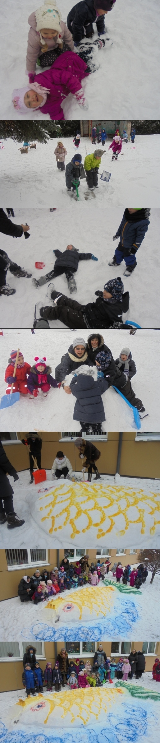 Lipdėme senius besmegenius, lipdėme ir statėme įvairias pilis. Ypač įspūdingas pilis pastatė „Girinukų“ ir „Mikės pukuotuko“ grupių vaikai. Tai pilys su visais tuneliais… Kiek džiaugsmo buvo vaikams žaidžiant slėpynių. Kai pasnigo šviežias sniegas, darėme sniego angelus. Oi, kaip smagu ir gera. „Nykštukų“ ir „Kačiukų“ grupės auklėtojos Gražina Šimonienė, Regina Katinienė ir Lina Jarackienė kartu su savo ugdytiniais ir padėjėja Rasa Balčiūniene, nutarė išbandyti savo kūrybiškumą ant sniego. Kūrėme, statėme, kasėme, piešėme ir kūrynį pavadinome „Auksinė žuvelė“. Daug emocijų buvo vaikams ir tėvams. Einant į namus vaikai vedėsi savo tėvelius nusifotografuoti prie jų statyto kūrynio ir būtinai sugalvoti po stebuklingą norą, kurį išpildys „Auksinė žuvelė“. Kiek buvo teigiamų emocijų vaikams ir juoko tėvams. Šiuo statiniu darželio bendruomenė džiaugėsi visą sausio mėnesį, kol vasario mėnesio lietus jį ištipdė. Bet visą tai išliks vaikų širdelėse ir tėvelių darytose nuotraukose.