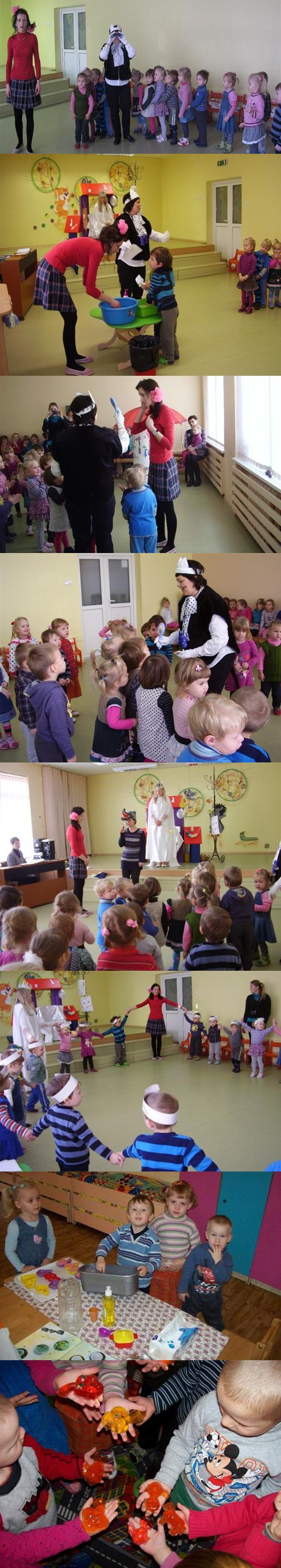 Rytmetyje dalyvavo „Meškiukų“ grupės vaikučiai, vyr. auklėtoja R. Rudienė, „Drugelių“ grupės vaikučiai,auklėtoja D. Aliukienė. Į pagalbą pasikvietėme koleges, kurios mielai sutiko atlikti šiuos vaidmenis: „Švaros fėja“ – vyr. auklėtoja. I. Liktorienė ir „Vilkas-sargybinis“- auklėtoja D. Gedvilienė.