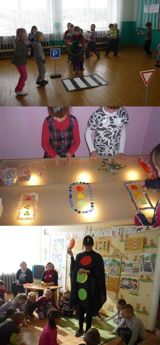 Antradienį aiškinomės žodžių „Gatvė“, „Kelias“, „Šaligatvis“, „Dviračių takas“ reikšmę. Taip pat žaisdami mokėmės kaip taisyklingai pereiti gatvę, ką reiškia pagrindiniai kelio ženklai, kam jie reikalingi. Vėliau ženklus vaikai kūrė iš įvairių akmenėlių, gamtinės medžiagos prie šviesos stalo.