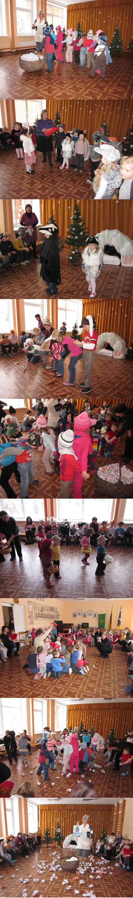 Kai miške daug sniego, žvėreliai negali susirasti maisto. Jiems reikia padėti. Patys mažiausieji, lopšelinukai, apsirengę bobulytėmis ir diedukais, žvėreliams atnešė dovanų: morkų, kopūstų, bulvių, obuolių. Kiškienė priminė, kad būtina pasidaryti lesyklėles ir padėti paukšteliams išgyventi kitą žiemos pusę.