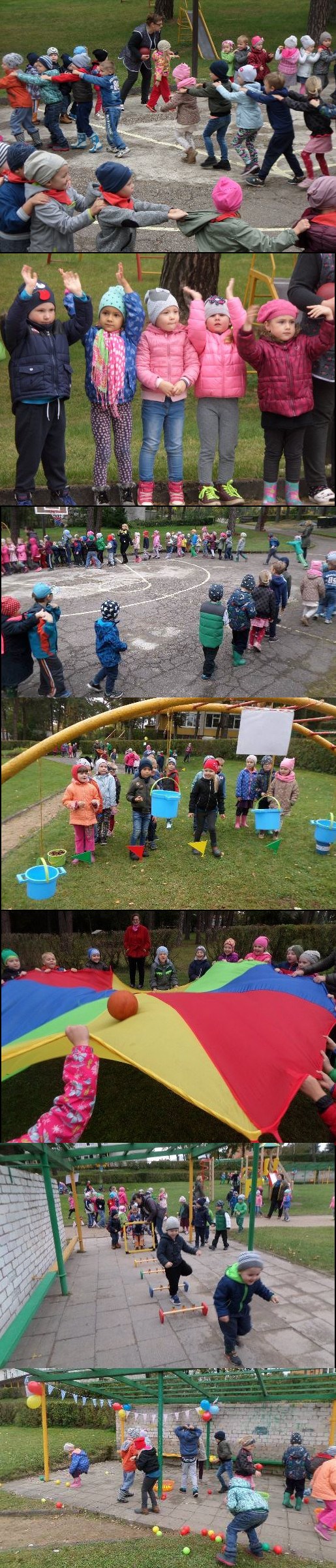 Vaikų veikla lauke – aktuali, neatsiejama ir nenutrūkstama ugdymo(si) proceso dalis. Ieškant lauko erdvių plėtros bei priemonių funkcionalumo aktyviai vaikų veiklai, 2016 m. Grigiškių darželyje-mokykloje „Pelėdžiukas“ buvo organizuota akcija „Daug judėsi-būsi sveikas“, skirta Pasaulinei kūno kultūros ir sporto dienai paminėti. Pasirinkta visoms grupėms aktuali tema „Rudens gėrybės“. Kiekvienos grupės auklėtojos sukūrė erdvę judėjimui: „Moliūgo sūpynės“, „Spalvoti obuoliukai“, „Kiškio daržo labirintai“, „Paruošk atsargas voverytei“, „Bulviakasis“. Kuriant judėjimo erdves buvo stengiamasi ne tik išnaudoti įstaigos kiemą, panaudoti sportinį inventorių, bet ir žaidybinėse veiklose integruoti vaikų surinktą gamtinę medžiagą: kankorėžius, giles, kaštonus. Į pramogą vaikai atvyko „traukinukais“. Linksmai pajudėję bendroje, improvizuotoje mankštoje, vaikai skubėjo išbandyti paruoštas sportines užduotis: šokinėjo per kliūtis, „kiškio darže“ lindo pro lankus, įsikibę į „parašiuto“ kraštą sūpavo „moliūgą“, su entuziazmu mėtė į kibirėlius kankorėžius ir kaštonus – ruošė atsargas voverytei (vikruolė tikrai neliks alkana žiemą, nes vaikai buvo taiklūs). Mažieji surinko ir išrūšiavo įvairiaspalvius obuoliukus bei atsakingai dalyvavo „bulviakasyje“ – rinko giles.