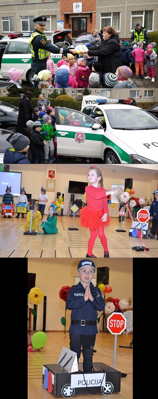 Aiškinomės kam reikalingi atšvaitai. O kokia pramoga be dainų? Visi kartu dainavome „Mėlynąjį autobusiuką“, „Mažas mašinėles“, šokome pagal „Šviesoforo dainelę“. Renginio kulminacija tapo policijos pareigūnų apsilankymas. Jie pakvietė mažuosius eismo dalyvius iš arti apžiūrėti kelių policijos automobilį ir jame esančias priemones. Betarpiškai bendraudami su policijos pareigūnais, vaikai turėjo unikalią galimybę „pasimatuoti“ policininko profesiją, pasėdėti už jų automobilio vairo, įjungti švyturėlius, pakalbėti per garsiakalbį, raciją.