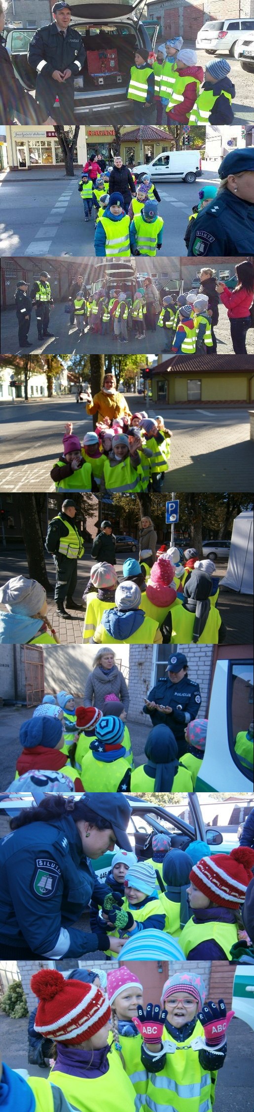 Kad įtvirtintų saugaus eismo žinias, „Čiauškučių“ (aukl. V. Urbonienė), „Žiniukų“ (aukl. R. Klymantienė), „Svajoklių“ (aukl. V. Petronytė), „Smalsučių“ (aukl. A. Jociuvienė) grupių vaikai keliavo į Šilutės miesto centrą prie šviesaforo mokydamiesi, kaip saugiai pereiti gatvę tam numatytose vietose – per pėsčiųjų perėjas. Be to, mažieji labiausiai nekantravo susitikti su jų laukiančiais policijos pareigūnais.