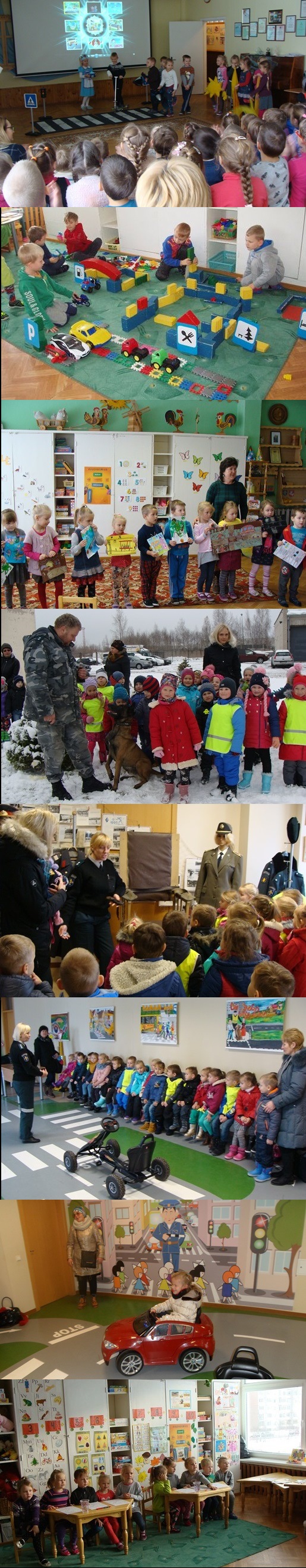 Įsimintina buvo trečiadienio diena. Jos metu vyresniųjų ir priešmokyklinių grupių vaikai lankėsi Mažeikių raj. policijos komisariate. Su dideliu susidomėjimu vaikai žiūrėjo policijos kinologo ir jo šuns Granto pasirodymą. Policijos pareigūnė supažindino su policijos patalpose įrengtu muziejumi, vaizdo kameromis stebimą miestą, saugaus eismo klase. Visi ugdytiniai saugaus eismo klasėje išbandė važiavimą mini kartingais, automobiliais pakartojo saugaus eismo taisykles gatvėje. Diskutavo nelaimingų atsitikimų priežastis ir pasekmes kelyje.