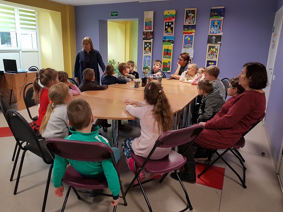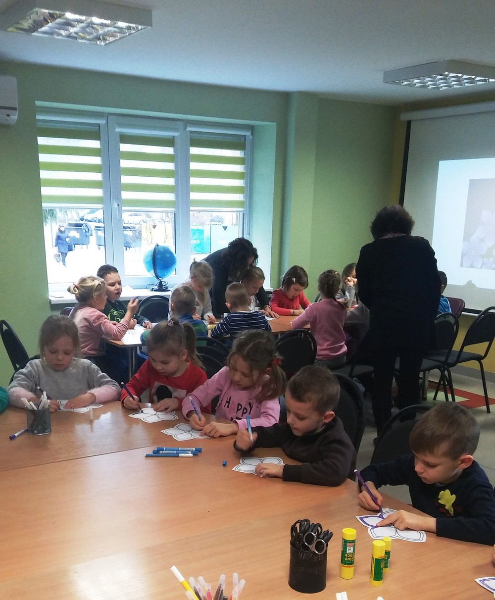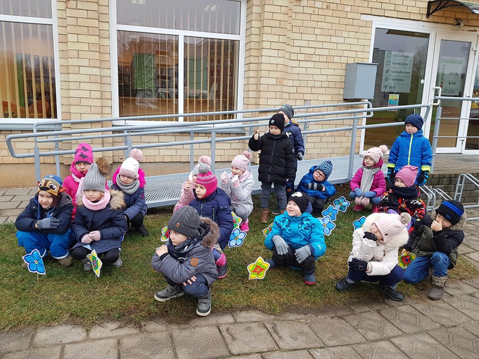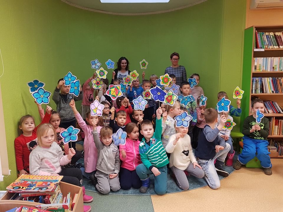 Panevėžio lopšelio- darželio „Puriena“ priešmokyklinių „Pelėdžiuko“ ir „Vabaliuko“ grupių vaikai vedini pedagogių: Jolantos Aleknavičiūtės, Loretos Jatautienės, Justinos Čielės  bei auklėtojos padėjėjos Pranės Šimoliūnienės, rinkosi šios dienos paminėti į mikrorajono vaikų biblioteką „Žalioji pelėda“.
