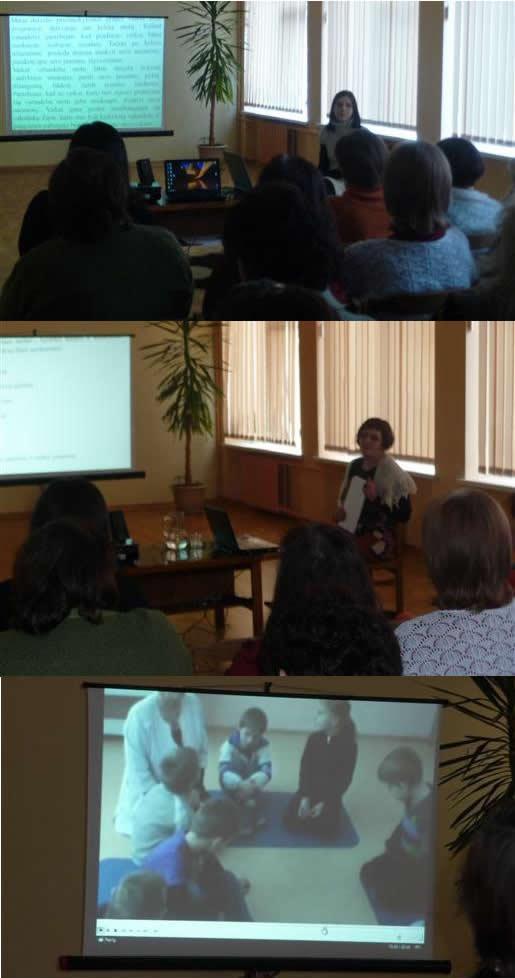 Loopedė Zita Podlipajevienė ir spec. pedagogė Albina Sadauskienė kalbėjo apie logopedo taikomus emocinio intelekto lavinimo būdus bei supažindino su sutrikusios raidos vaikų emocijų ypatumais bei jų lavinimu per pažintinę veiklą. Apibendrino kas sąlygoja vaiko emocinės raidos vystymąsi, kuo išsiskiria sutrikusios raidos vaikai: dažnai susiduria su bendravimo sunkumais, dėmesio nesukaupimu, sudėtinga adaptacija, motyvacijos stoka, pažintinės raiškos sutrikimais. Pedagogės akcentavo, jo tiek normalios, tiek ir sutrikusios raidos vaikų ugdymosi tikslai tie patys. Skiriasi tik ugdymo būdai, priemonės ir tempai. Nors sutrikusios raidos vaikų vystymasis ir lėtesnis, tačiau kryptingai ugdant pasiekiama gana gerų rezultatų. Norint pradėti ugdymą svarbu atrasti ryšį tarp pedagogo ir vaiko. Pedagogės pastebėjo, jo geriausias ir vaikams priimtiniausias ugdymo metodas–aktyvus veikimo būdas, tai yra žaidybinė veikla, kurios metu galima ir prevenciškai stiprinti vaiko įgūdžius, spręsti jam tuo metu aktualias problemas. Žaisdami vaikai išmoksta pažinti save, bendrauti, priimti spredimus, įveikti sunkumus bei patenkina savo prigimtinį poreikį–judėti.