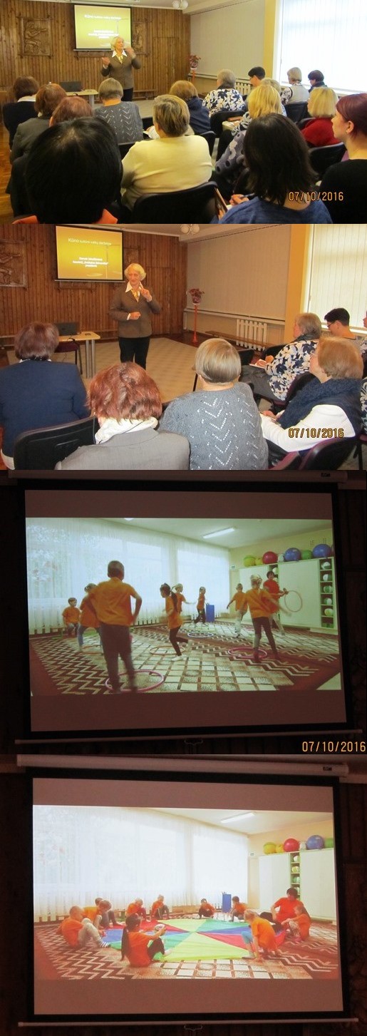 Asociacijos prezidentė Danutė Jakučiūnienė vedė seminarą, kurį finansavo sveikatos apsaugos ministerija. Lektorė kalbėjo apie fizinio aktyvumo poveikį vaiko sveikatai. Plačiai aptarė kūno kultūros vaikų darželyje programą, tikslus, struktūrą. Analizavo, koks turi būti kūno kultūros vaikų darželyje turinys, darbo formos ir jų organizavimo metodika. Buvo gilinamos pedagogų žinios apie kūrybiškumo ugdymą judant. Labai svarbu įvairių veiklų integracija kūno kultūros procese. Akcentavo, koks svarbus šeimos ir darželio bendradarbiavimas, užtikrinant vaikų judėjimo poreikį. Priešmokyklinio ugdymo pedagogė Sigita Remeikienė parodė ir pakomentavo kūno kultūros valandėlės įrašą. Lektorė ir pedagogai filmuotą medžiagą komentavo, detaliai aptarė seminarą, diskutavo. Svečiai seminaro pabaigoje turėjo galimybę pasivaikščioti po grupes, susipažinti su modernizuotu darželiu.