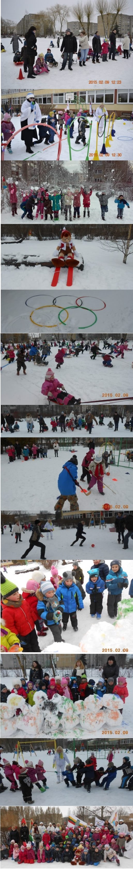 2015 m. vasario 9 d. darželio aikštyne pedagogai organizavo „Sniego šventės“ dalyviams rogučių, ledo ritulio, biatlono estafetes, senių besmegenių, sniego pilių statymo, piešinių ant sniego konkursus, virvės traukimo, futbolo žaidimo ant sniego varžybas. Aikštėje vyko smagus sniego mūšis tarp grupių, o futbolo varžybose susitiko mamytės ir pedagogės prieš tėvelius. Virvės traukimo varžybose grupės galynėjosi dėl stipriausiojo vardo. Po varžybų dalyviai statė sniego pilis, senius besmegenius, piešė ant sniego.