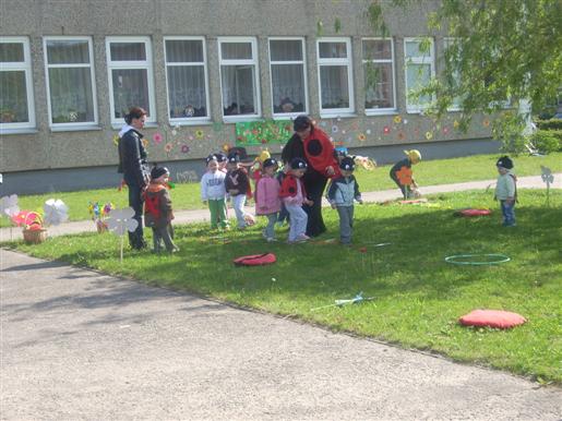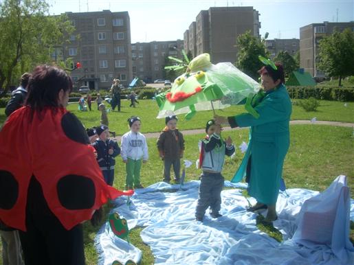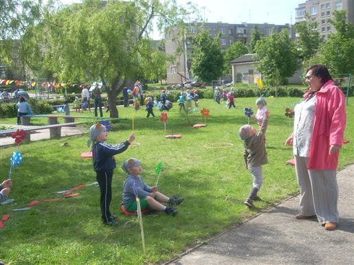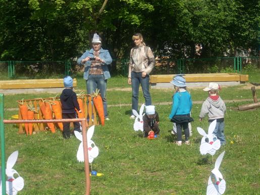 Kol vyresniųjų grupių vaikai ieškojo „lobio“ miesto stadione, mažųjų grupių vaikai darželio kiemelyje „rovė morkas“, „maitino muselėmis“ Varlę, išdykavo su Klounu.