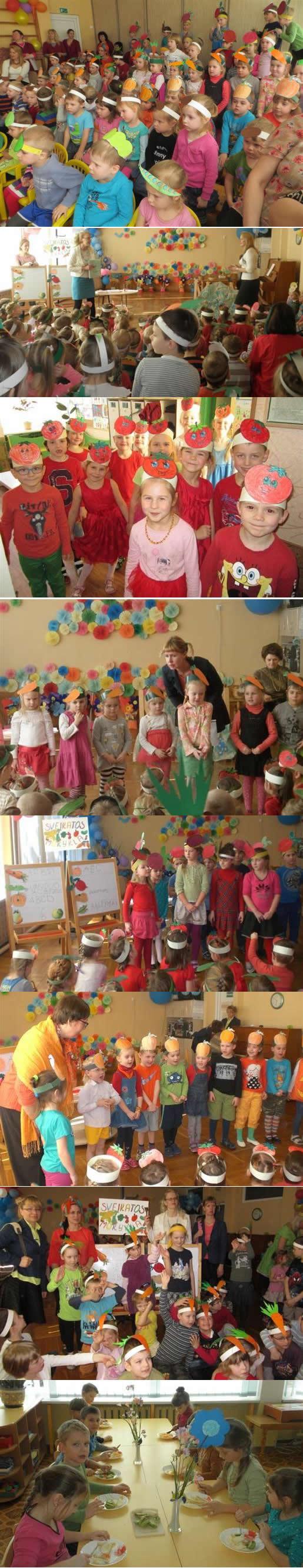 2014 m. kovo 27 diena – vaisių ir daržovių diena. Pasakų personažai: mokytoja (E. Mineikienė), mokinukės (D. Margelienė ir M. Monkevičienė), obuoliukas (V. Veizbonienė) su kriaušyte (D. Razminienė) sukvietė visus „vaisius ir daržoves“ į „Sveikatos mokyklėlę“. Visą savaitę vaikai ruošėsi. Kiekviena grupė stengėsi kuo daugiau sužinoti apie pasirinkto vaisiaus ar daržovės naudą, aiškinosi kokių vitaminų turi. Vaikai gaminosi karūnėles, piešė vaisius ir daržoves, o spalvindami užduočių knygeles, prisiminė, kodėl reikia sveikai maitintis. Lopšelio-darželio darbuotojai, vaikų tėveliai dalinosi savo mėgstamais sveiko maisto receptais. Renginio metu vaikai pasakojo ką sužinojo, atliko namų darbus. Grįžę į grupes vaišinosi vaisių salotomis, gėrė pačių išspaustas sultis.
