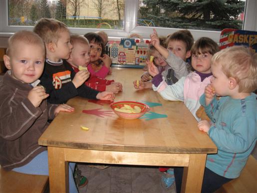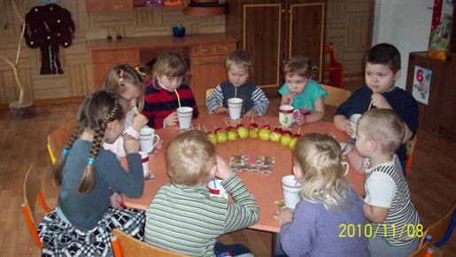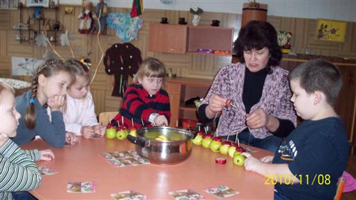 Tą rytą mišraus ankstyvojo amžiaus „Kodėlčiukų“ grupės vaikučius pasitiko su obuolių kraitele (vyresn. auklėtoja J. Stapušaitienė). Vėliau visi kartu vaisius apžiūrėjo, lietė, uostė, ragavo. Meninės veiklos metu spalvino jų trafaretus, lipdė, karpė, klijavo.