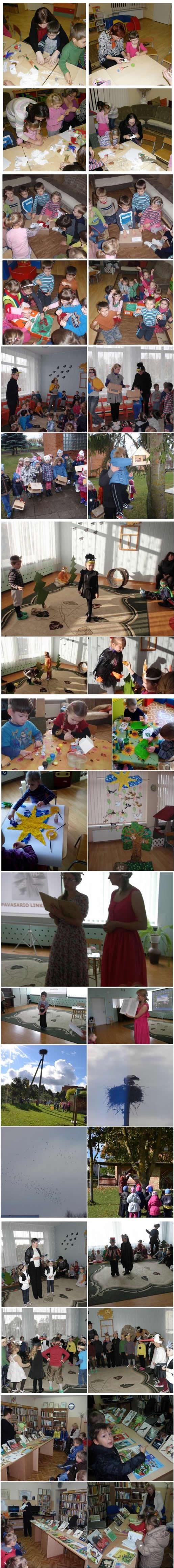 Savo lopšelyje – darželyje surengėme vaikų – tėvelių kūrybinių darbelių parodą „Šarka Petrone, sudėk figūrėlių dėlionę“, kurios metu tėveliai ir vaikučiai aktyviai kūrė paukščius iš geometrinių figūrų. Parengėme ir nusiuntėme vaikų įvairia technika pieštus ir aplikuotus piešinius, respublikiniam ikimokyklinio ir priešmokyklinio amžiaus vaikų piešinių konkursui „Pavasarį atneša paukščiai“, kurį organizavo Radviliškio lopšelis-darželis „Eglutė“. Besiruošdami parodai, kuri buvo rengiama Kauno Maironio lietuvių literatūros muziejuje, “Boružiukų”, “Žiogelių” ir “Viščiukų” grupės ugdytiniai kūrė pasirinktos K. Donelaičio poemos “Metai” ištraukos iliustraciją: vieni klijavo krepiniu popieriumi saulę, debesėlį ir žolytę, kiti įvairia technika kūrė paukštelius, štampavo medžio kamieną, guašu ir skutimosi putomis dažė medžio lapus, mažiausieji “Viščiukų” grupės ugdytiniai suko lizdą paukšteliams ir t. t.