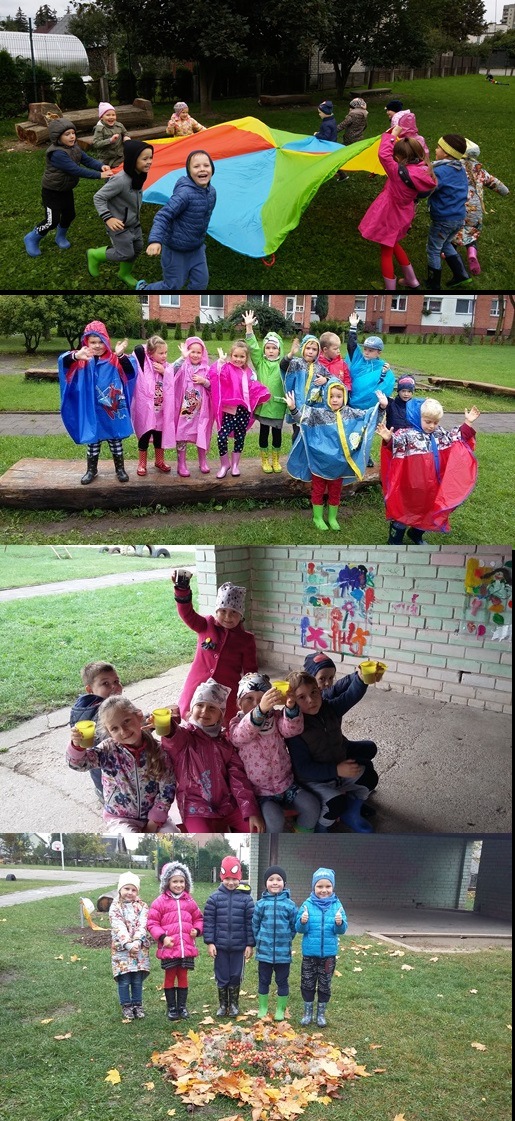 2017 m. Marijampolės vaikų lopšelio-darželio „Vaivorykštė“ „Ančiukų“ grupės ugdytiniai kartu su auklėtojomis Rasa Savickiene ir Nijole Piliponiene visą rudenį įgyvendino trumpalaikį projektą „Nėra blogo oro. Yra bloga apranga“. Šio projekto tikslas – ugdyti saugiai besijaučiančius, sveikus, aktyvius fiziškai ir socialiai, savarankiškus, gebėjimus atskleidžiančius vaikus. Prie šio tikslo auklėtojos, tarsi iššūkį sau, pridėjo dar vieną svarbų tikslą – išmėginti netradicinį ugdymą. Visą rudenį su vaikučiais stengėsi praleisti kuo daugiau laiko gryname ore. Vaikai turėjo puikią galimybę stebėti atkeliaujantį, įsibėgėjantį ir besibaigiantį rudenėlį, išmatuoti balų gylius, skaičiuoti lašus, krintančius nuo stogo. Išmoko džiaugtis bet kokiu oru: realiai pajuto lietaus lašus ant veido, plukdė laivelius, leido lėktuvėlius, gėrė karštą arbatą su medumi lauke, ieškojo, kur prasideda ir baigiasi šalna… Daug dalykų pamatė kitaip, savaip. Tie, kas galvoja, kad tik saulės spinduliai teikia džiaugsmą, niekada nešoko lietuje. O „Ančiukų“ grupės ugdytiniai šoko.